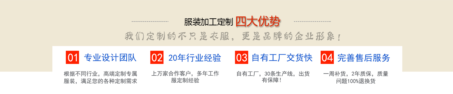 服裝加工網(wǎng)是一家及設(shè)計、生產(chǎn)、銷售為一體的專業(yè)服裝生產(chǎn)型企業(yè), 根據(jù)客戶需求定制西服襯衫工作服大衣棉服等產(chǎn)品,近二十年工作服職業(yè)裝定做經(jīng)驗(yàn)積累, 工期短交貨及時,免費(fèi)提供團(tuán)體定制上門量體服務(wù),送貨上門,免費(fèi)修改,完善的售后服務(wù), 滿足您的各種定制需求!
